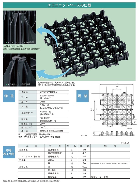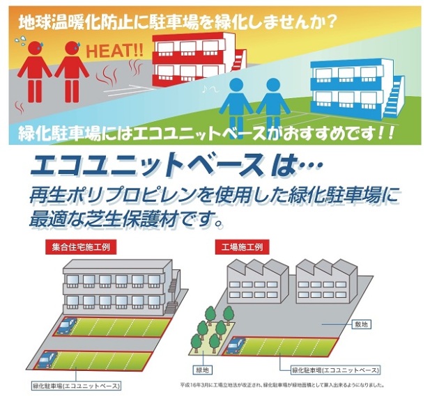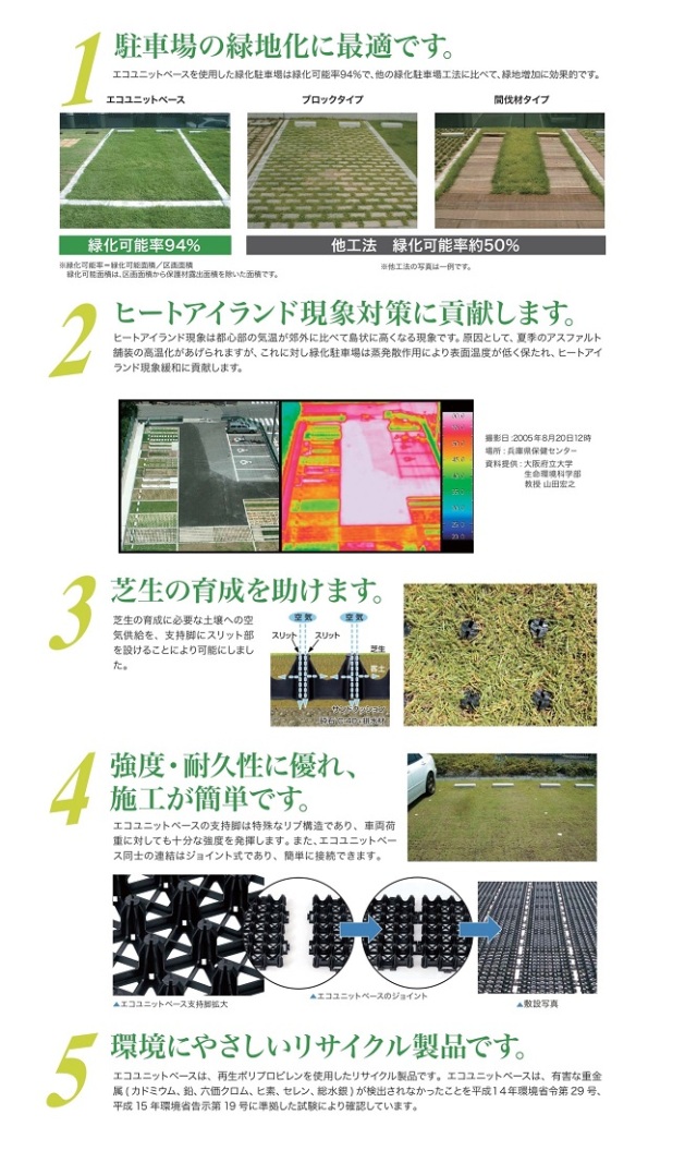 ※発送後キャンセル、及びお客様ご都合の返品や返金には対応出来かねますのでご注意ください。 ※北海道・沖縄県・離島への配送を指定されたご注文においては、割増運賃(都度お見積)が発生する場合がございます。 HOMEゴム・塩ビ マット、シート の商品一覧 公園・ゴルフ場・駐車場マット エコユニットベース 4枚セット 緑 価格: ¥7,500 (税込) [ポイント還元 75ポイント~] 販売期間: 数量: セット 在庫 ○ 返品についての詳細はこちら レビューはありません メーカー直送のため代引きでの決済は不可となります。銀行振り込み・コンビニ・クレジット・後払い決済でご購入下さい。 エコユニットベース 4枚セット 緑 エコユニットベースは再生ポリプロピレンを使用した緑化駐車場に最適な芝生保護材です。 ・緑化可能率94%!! エコユニットベースを使用した緑化駐車場は緑化可能率94%で、 他の緑化駐車場工法に比べて、緑地増加に効果的です。 ・ヒートアイランド現象対策に貢献します。 ヒートアイランド現象は都心部の気温が郊外に比べて島状に高くなる現象です。 原因として、夏季のアスファルト舗装の高温化があげられますが、これに対し緑化駐車場は蒸発散作用により表面温度が低く保たれ、ヒートアイランド現象緩和に貢献します。 ・芝生の育成を助けます 芝生の育成に必要な土壌への空気供給を、 支持脚にスリット部を設けることにより可能にしました。 ・強度・耐久性に優れ、施工が簡単です。 エコユニットベースの支持脚は特殊なリブ構造であり、車両荷重に対しても十分な強度を発揮します。また、エコユニットベース同士の連結はジョイント式であり、簡単に接続できます。 ・環境にやさしいリサイクル製品です。 エコユニットベースは、再生ポリプロピレンを使用したリサイクル製品です。 製品寸法(mm):525×525×70 重量:約1.9kg 材質:再生ポリプロピレン 圧縮強度:401kN /枚(1458kN /m2) ※代表値(保証値ではありません) 耐荷重:10t車以下 /(総荷重20t車以下) 耐寒性:10℃ ※プラスチックデータハンドブックより抜粋 耐熱性:100℃ ※プラスチックデータハンドブックより抜粋 この商品を買った人はこんな商品も関心を持っています。 筋入りゴムマット(B山ゴムマット)10m巻 タテ筋タイプ ¥12,500(税込) 数量: 巻 筋入りゴムマット(B山ゴムマット)10m巻 ヨコ筋タイプ ¥12,500(税込) 商品を見る 筋入りゴムマット(B山ゴムマット)20m巻 タテ筋タイプ ¥24,000(税込) 数量: 巻 ポイントゴムマット 10m巻 定価(税込み): ¥38,704(税込) ¥15,429(税込) 数量: 巻 エコ歩行者マット 定価(税込み): ¥19,800(税込) ¥5,765(税込) 数量: 巻 【法人・個人事業主様限定】らくらくマット 10mm厚×1m幅×2m ¥15,795(税込) 数量: 枚 【法人・個人事業主様限定】らくらくマット 15mm厚×1m幅×2m ¥24,070(税込) 数量: 枚 【法人・個人事業主様限定】らくらくマット 20mm厚×1m幅×2m ¥28,080(税込) 数量: 枚
